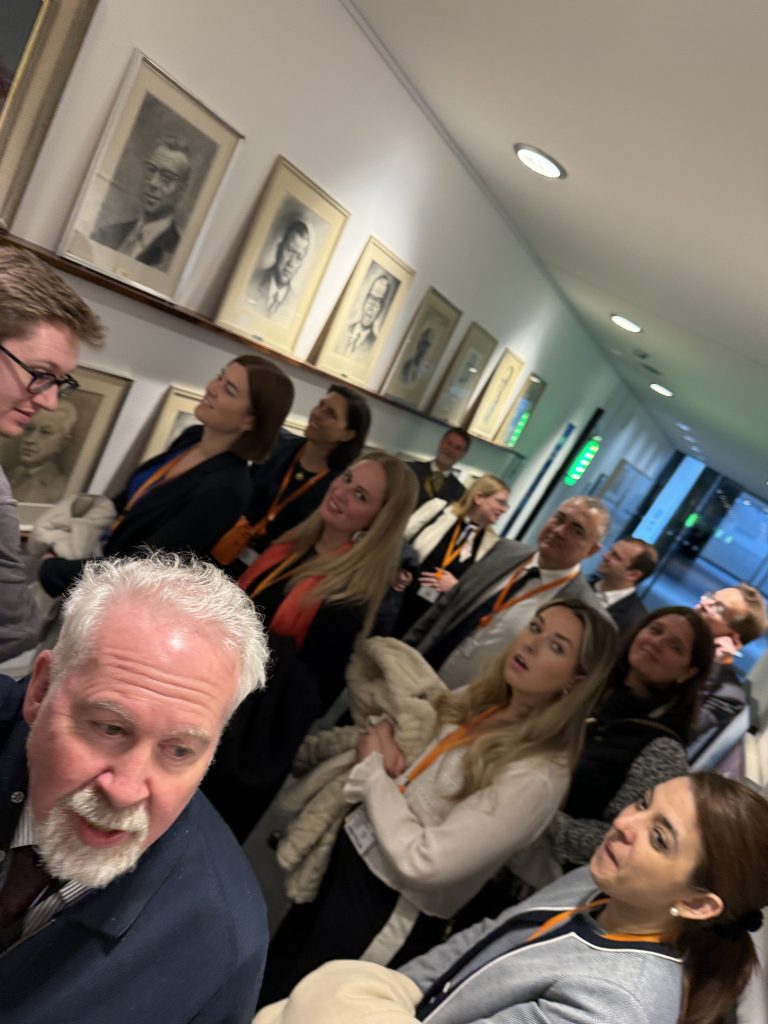 A full group of Oxonians and friends from our sister societies met up in the spring sun at 10am in front of the Court. We were met by a lively and experienced guide who took us through the ground floor areas and the judges gallery. We learned that the ECJ library holds 364000 books and other printed material and that it is the largest legal library in Europe, that there are 2300 people employed of who, a thousand translators and 500-600 lawyer linguists. They have 54 judges, ten chambers and around 900 cases a year. So it is a busy place! After the tour, we had a talk by the Irish judge, C. Mac Eochaidh, Judge at the General Court. He gave an insightful and personal talk which catered both for all the legal minds amongst us, and all of us who knew little of the workings of the court.